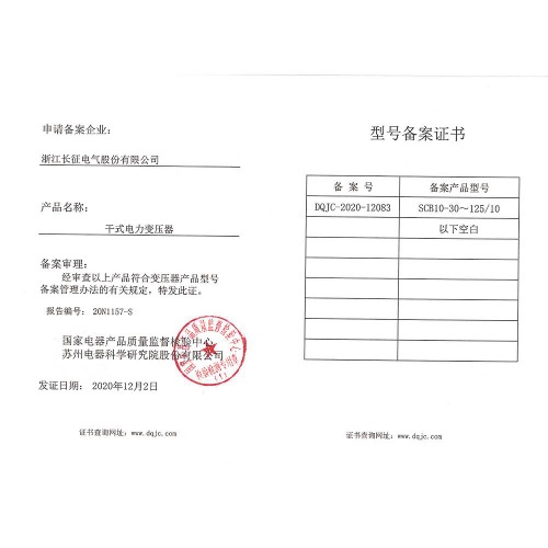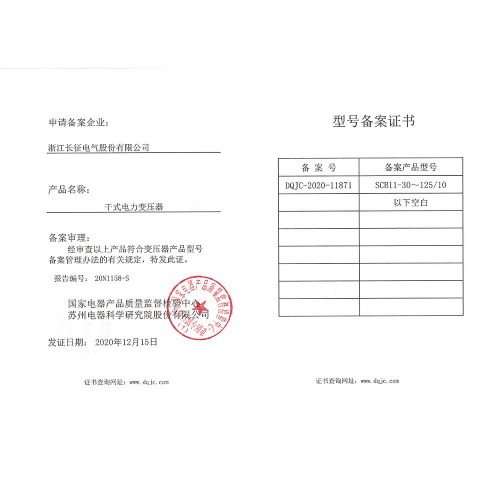 SCB11-30~125/10干式电力变压器 型号备案证书