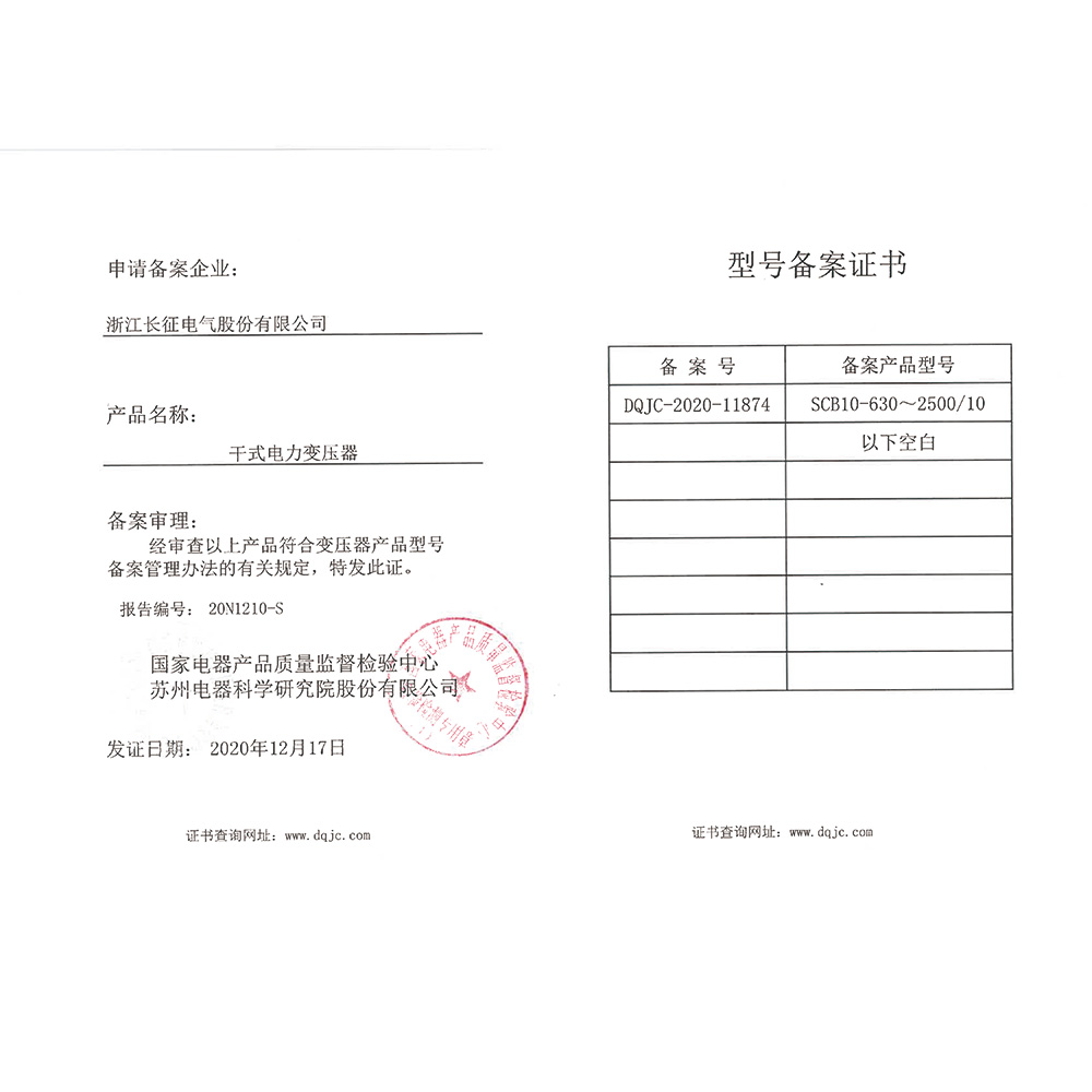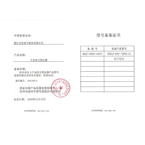 SCB10-630~2500/10干式电力变压器 型号备案证书