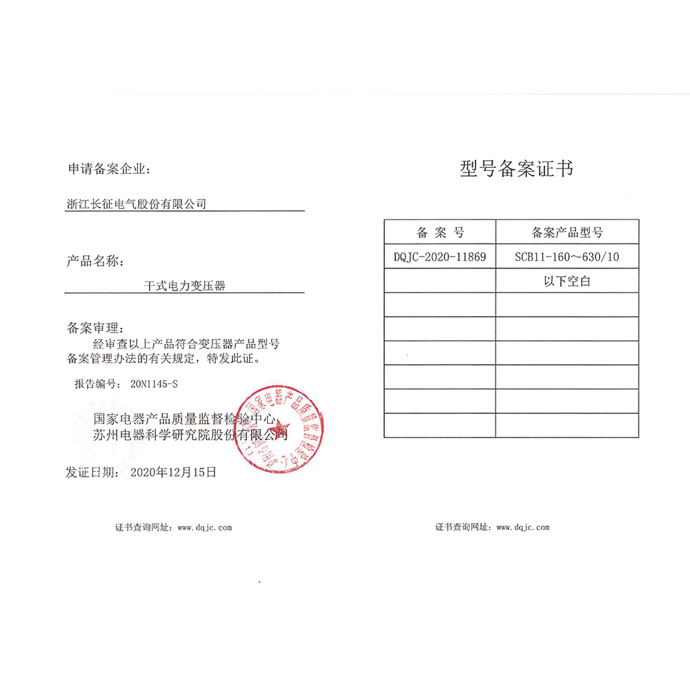 SCB10-160~630/10干式电力变压器 型号备案证书