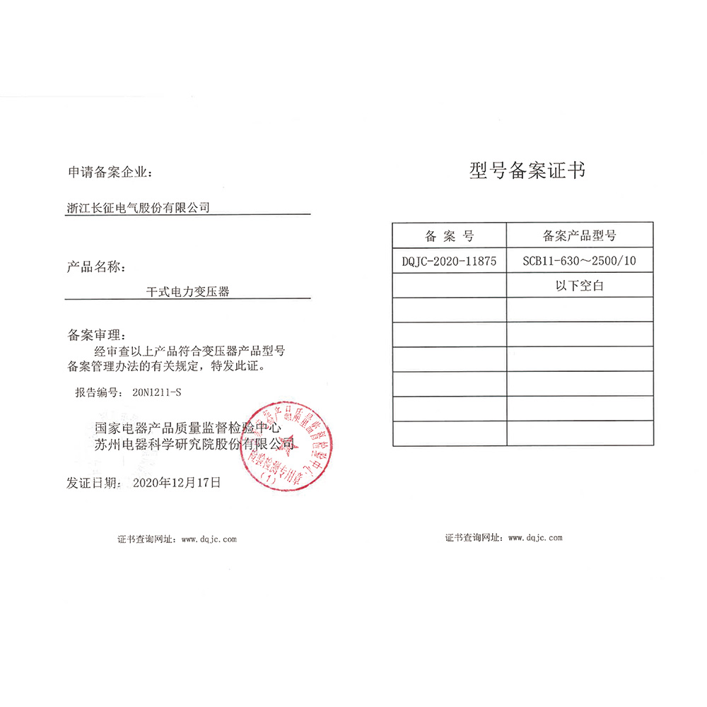 SCB11-630~2500/10干式电力变压器 型号备案证书