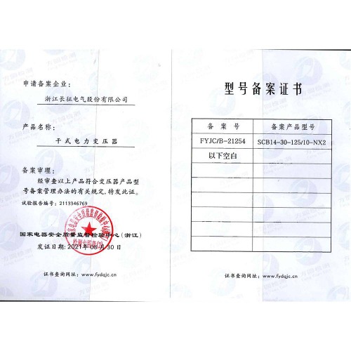 SCB14-30-125/10-NX2干式电力变压器 型号备案证书