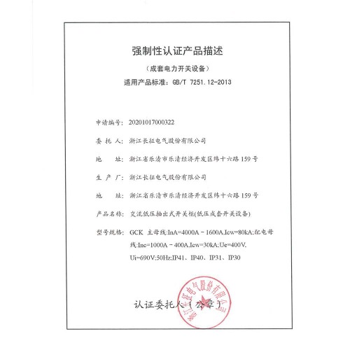 GCS低压配电屏(低压成套开关设备)强制性认证产品描述