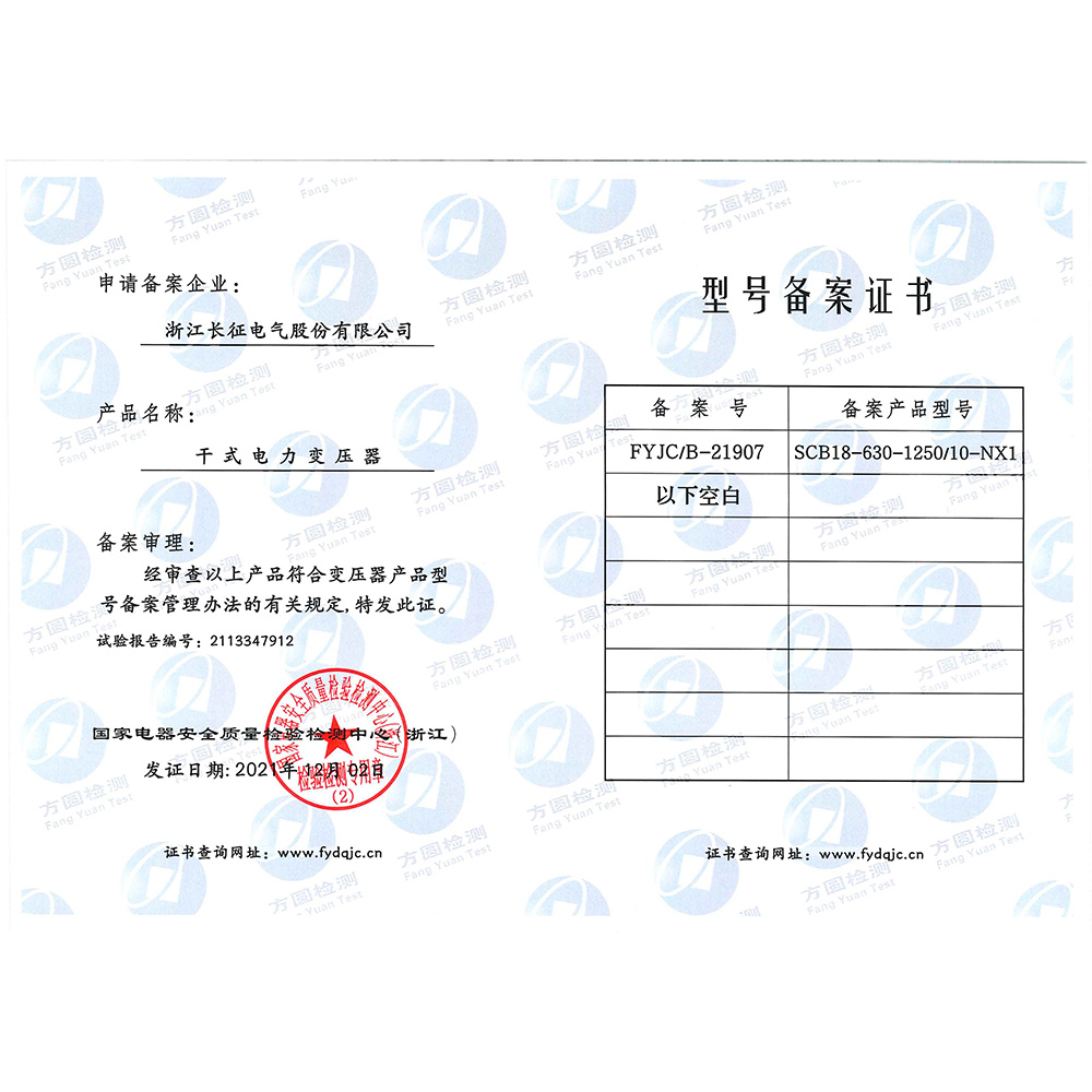 SCB18-630-1250/10-NX1干式电力变压器 型号备案证书