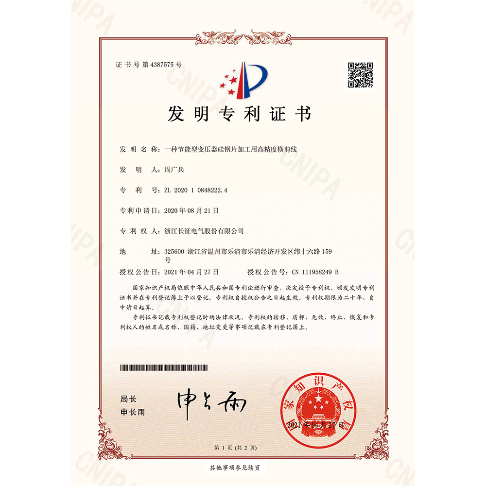 一种节能型变压器硅钢片加工用高精度横剪线 发明专利证书