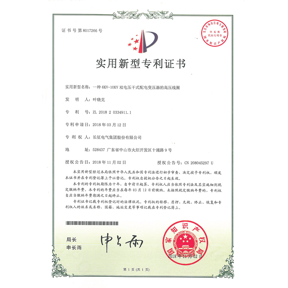一种6KV-10KV双电压干式配电变压器的高压线圈 实用新型专利证书