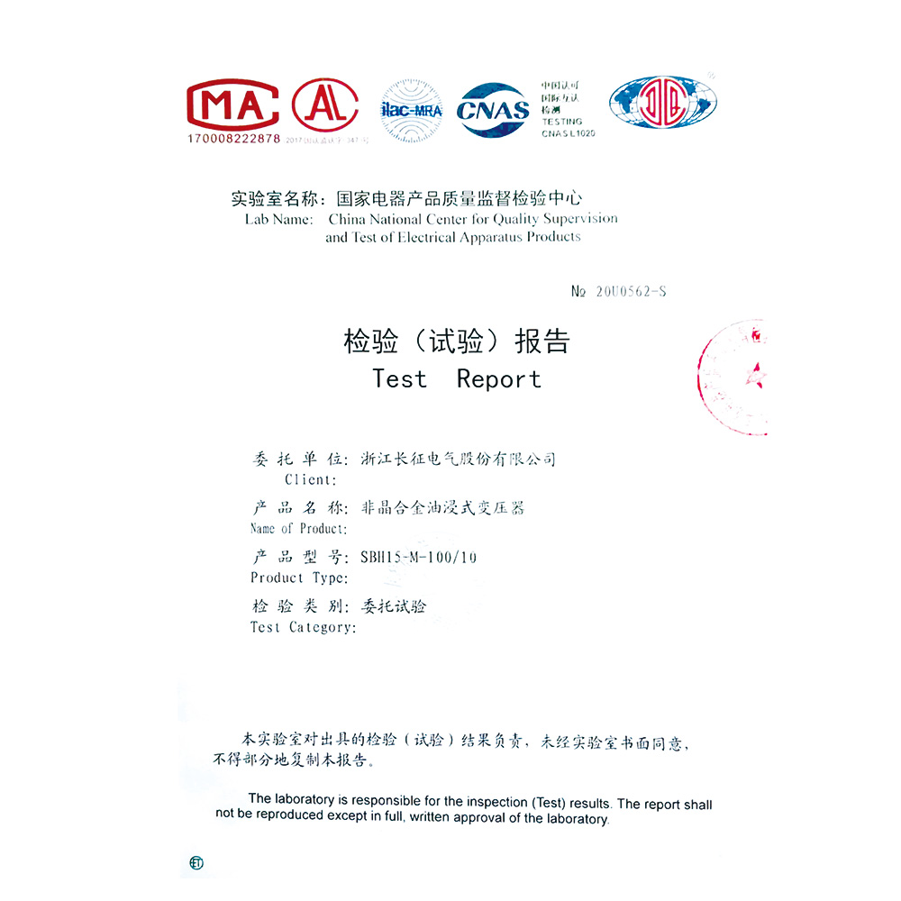 SBH15-M-100/10非晶合金油浸式变压器 检验报告