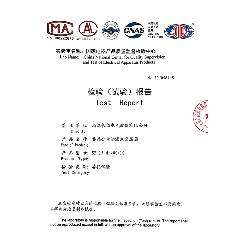 SBH15-M-400/10非晶合金油浸式变压器 检验报告