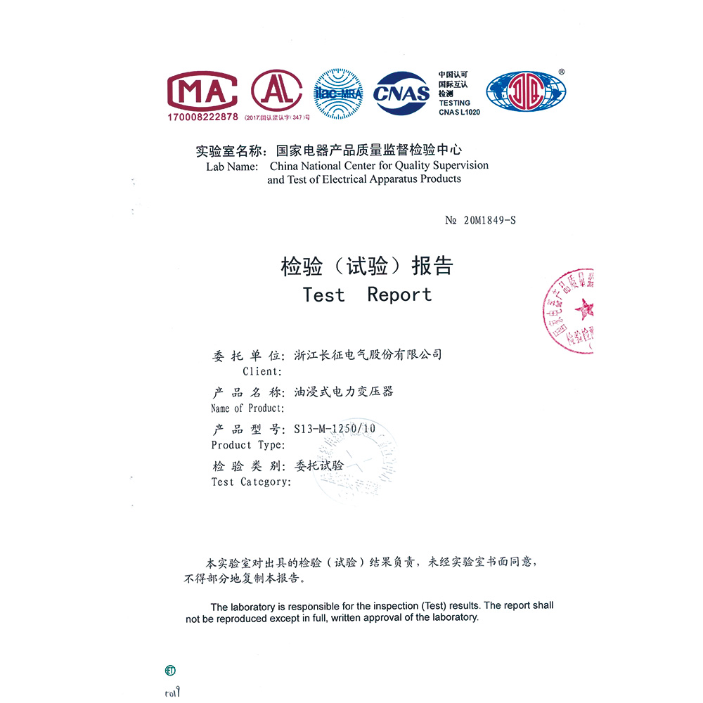 S13-M-1250/10油浸式电力变压器 检验报告