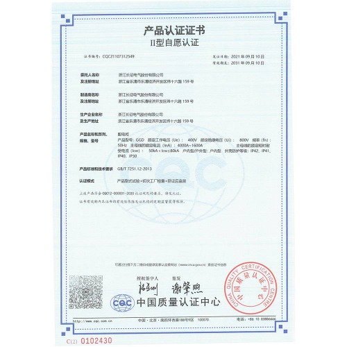 GGD配电柜 产品认证证书