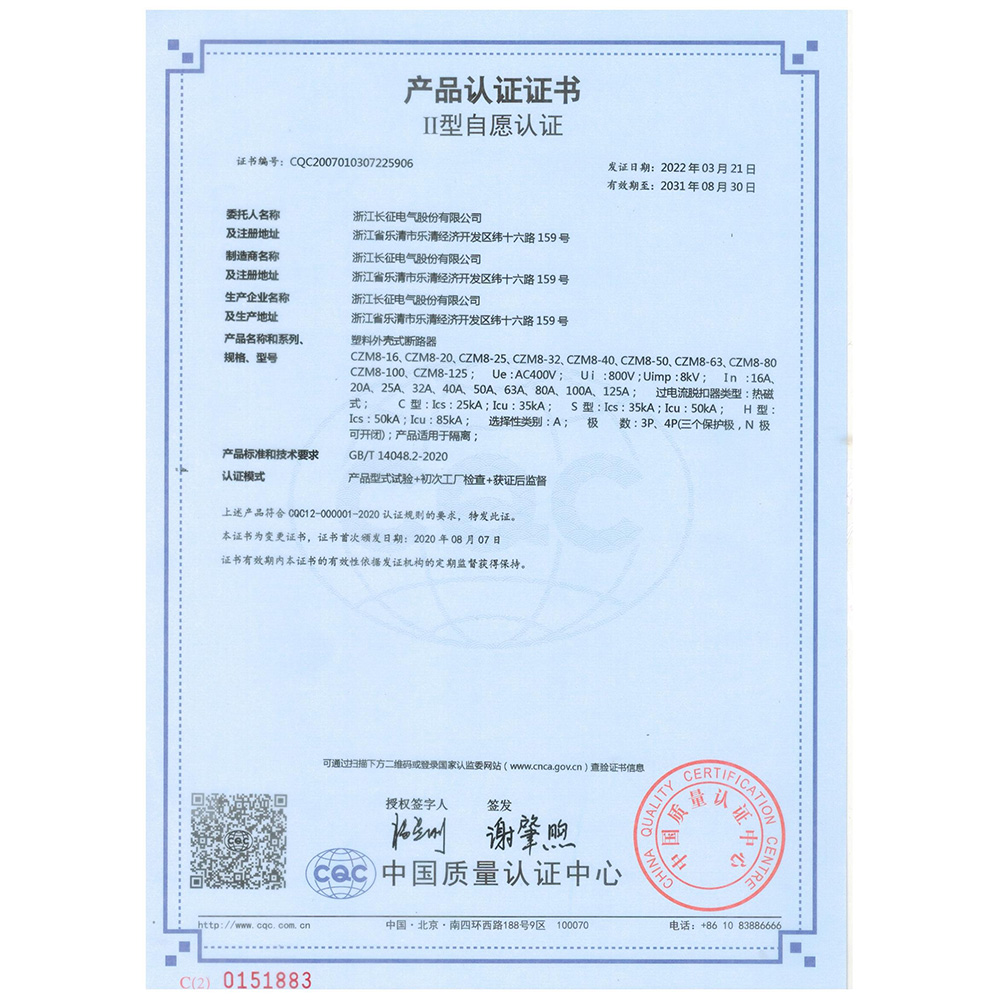 CZM8塑料外壳式断路器 产品认证证书