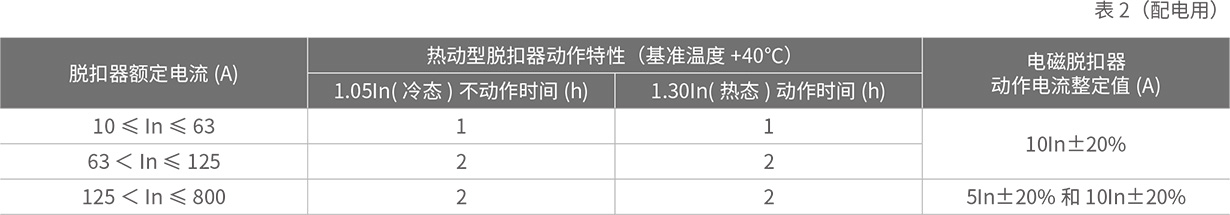 断路器热动型脱扣器具有反时限特性,电磁脱扣器为瞬时动作,特性见表 2、表 3