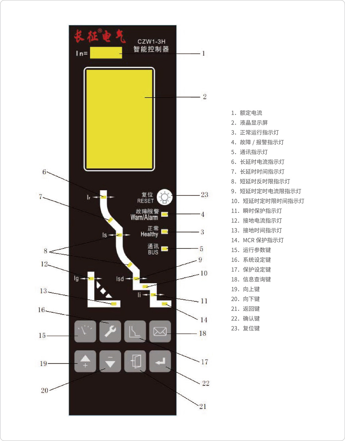 断路器遇故障分断后,智能控制器能显示出故障类别、故障相序及故障电流值、分断动作时间值。