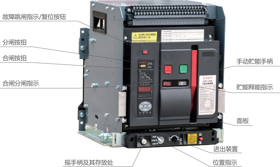 CZW1 系列智能型万能式断路器用于控制和保护低压配电网络。一般安装在低压配电柜中做主开关起总保护作用。其技术性能已达到了当代国际上同类型产品先进水平。 1、交流额定电流 630A-6300A; 2、短路分断能力 80kA-120kA( 有效值 ); 3、额定工作电压 AC690V 及以下; 4、具有 3 极和 4 极: 5、抽屉式和固定式; 6、可倒进线安装; 7、多种智能控制器,提供不同功能; 8、执行 IEC60947-2、GB/T14048.2 的标准。型号及其含义