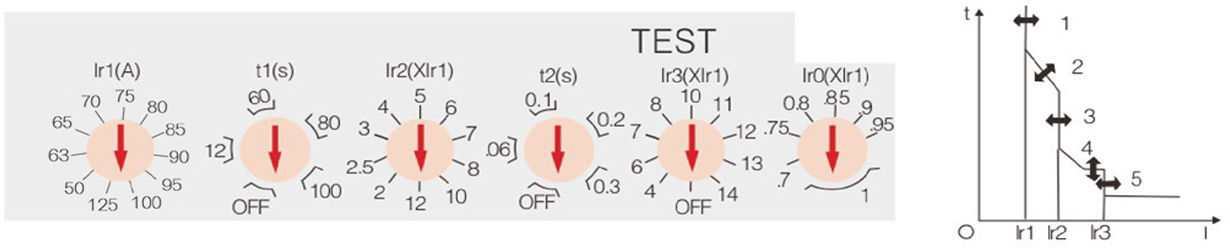 1、过载长延时动作电流 Ir1 调整根据断路器不同的额定电流可从 4 档到 10 档进行调整;
